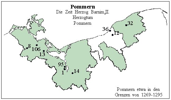 1295 bestätigte Adolf von Nassau die 1231 von Kaiser Friedrich II. erteilte Lehnshoheit Brandenburgs über Pommern. So kam es unter starker Beteiligung der Stände (Ritterschaft und Städte) zu Stettin [1] am 12. Juli 1295 zur erneuten Teilung Pommerns zur gesamten Hand, so dass die Einheit des gesamten Herzogtums gewahrt wurde. Bogislaw IV. erhielt den nördlichen Teil des Landes als Pommern-Wolgast mit Demmin [8] und Anklam [13] (Küstenregion), Otto I. den Teil südlich des Peeneflusses und der Ihna mit Stettin [1], Pommern-Stettin (Oder-Region). Das Haff, alle Flüsse und alle Häfen blieben gemeinsamer Besitz. Diese Teilung in Pommern-Wolgast und Pommern-Stettin blieb bis zum Erlöschen der Stettiner Linie im Jahre 1464 bestehen. 2)