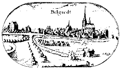 Die Kreisstadt Belgard [6], an der Mündung des Leitznitzbaches in die Persante, ist auf dem ziemlich ebenen Boden des ehemaligen eiszeitlichen Persantestausees 1299 mit lübischem Stadtrecht von Herzog Bogislaw IV. gegründet worden.1) Davor gab es südlich der Stadt einen wendischen Burgwall mit einem kleinen Dorf, den der Polenherzog Boleslaw III. 1102 und 1107/08 eroberte. Bischof Otto von Bamberg kam 1124 auf seiner Missionsreise durch Belgard. Die Burg war Zollhebestelle und zeitweilig Residenz Herzogs Wartislaws IV.