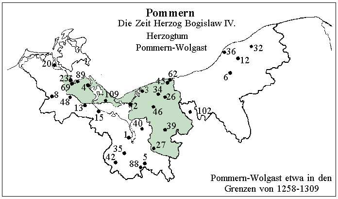 Die Herzöge Barnim I. und Bogislaw IV. bezeugten 1277 in Ückermünde [15] ihre Gründungsabsicht für Treptow an der Rega (Trzebiatow; Kreis Greifenberg) [45], nach lübischem Recht. 1)