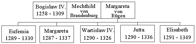 Eufemia: | Geboren 1289; Verheiratet mit König Christoph II. von Dänemark (Sohn des Königs Erik VII. und der Agnes von Brandenburg). Sie starb am 26. Juli 1330 und wurde in der Kirche von Sorø auf der Insel Seeland beigesetzt, ihr Gemahl, Christoffer, wurde an ihrer Seite beigesetzt, nachdem er 2. August 1332 in Nykøbing, auf der dänischen Insel Falster, gestorben war 2). |