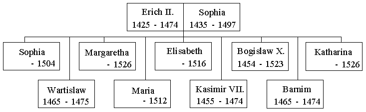 Sophia: | Heiratete zwischen dem 24. und 31. Mai 1478 in Anklam den Herzog Magnus von Mecklenburg-Schwerin (Sohn des Herzogs Heinrich II. von Mecklenburg-Schwerin und der Dorothea von Brandenburg). Sie starb 26. April 1504 in Wismar. 4) |