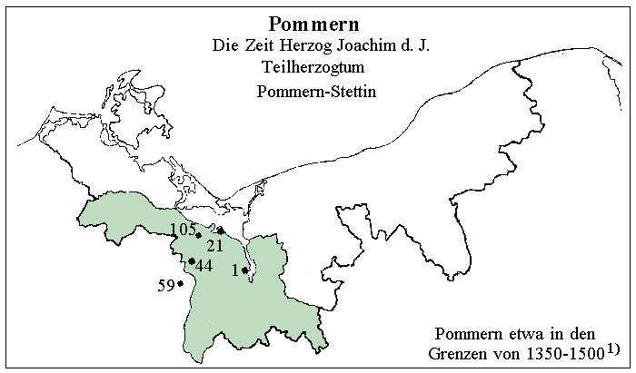 Mit Brandenburg, wo seit 1437 Friedrich d. j., des Kurfürsten II. Sohn, als Regent tätig war, befand sich der Herzog Joachim von Stettin, der sich 1437 mit Elisabeth, der Tochter von Johann, vermählte, in Frieden und Einverständnis. Er nahm zusammen mit dem Wolgaster Vettern an den Kriege gegen Mecklenburg (1440) lebhaften Anteil und gewann auch Anrecht auf die Eroberungen. Als jedoch Friedrich II. Markgraf geworden war, verlangte er aufgrund eines kaiserlichen Gebotenes 1444 von den Wolgaster Herzogen die Auslieferung des in ihrem Besitz befindlichen Teiles der Uckermark. Darüber kam es bei Pasewalk [44] zum Kampf, doch die Eroberung durch die Märker misslang; auch ihren übrigen kriegerischen Unternehmungen hatten keinen Erfolg. Man führte langwierige Verhandlungen, aber bald brach der Krieg wieder aus, an dem jetzt auch Joachim teilnahm, weil er wegen seines Besitzes in Beeskow mit Brandenburg in Streit geriet. Wie gewöhnlich wechselten wieder Frieden und Verhandlungen ab, es wurde um Pasewalk, Torgelow [105] und den anderen Orten gekämpft, man verhandelte in Prenzlau [59] oder Freienwalde, man setzte Schiedsrichter ein, doch endliche Frieden wurde erst am 3. Mai 1448 geschlossen. Friedrich gab seinen Anspruch auf Pasewalk auf , gegen die Zusicherung des Anfalls der Stadt nach dem Erlöschen der gesamte männliche Linie des pommerschen Herzogshauses. Zur gleichen Zeit schlossen die pommerschen Fürsten mit dem Markgrafen ein Landfriedensbündnis. Der Erfolg dieses Krieges, in dem die Pommern das wichtige Pasewalk behaupteten, wenn auch sonst die Uckermark fast ganz in brandenburgischen Besitz kam, war allein der hier bewiesenen Einigkeit der verschiedenen Linie des Herzogshauses zu danken. 3)