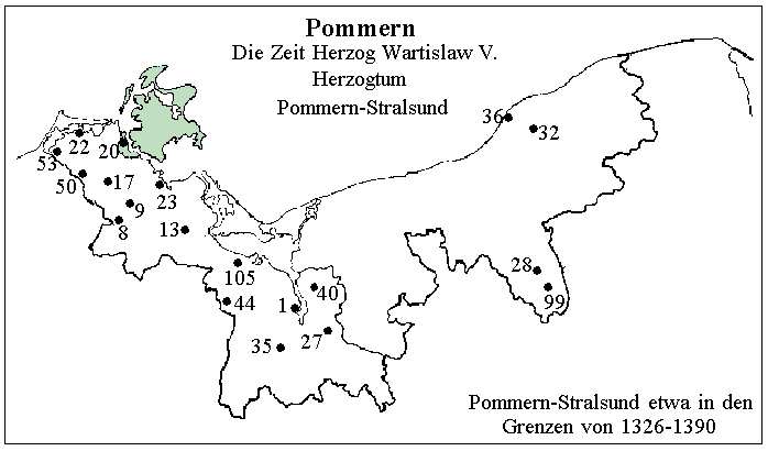 Wartislaw IV. starb am 1. August 1326 und hinterließ drei unmündige Söhne. Das veranlasste Heinrich II. von Mecklenburg, nach den rügischen Landen zu greifen. Er besetzte Barth [22], Grimmen [17] und Loitz [9] und ließ sich überall huldigen. Doch Stralsund [20] und Greifswald [23] sowie Anklam [13] und Demmin [8] schlossen sich zusammen, um den jungen Herzögen zu ihrem Recht zu verhelfen. Mit ihnen vereinigten sich König Waldemar von Dänemark und Graf Gerd von Holstein, die alten Feinde der Mecklenburger. Mit beträchtlichen finanziellen Mitteln stellten sie ein Heer auf und schlugen am 13. März 1327 den mecklenburgischen Herzog in die Flucht. Die Kämpfe zogen sich noch bis in das Jahr 1328 hin. Schließlich kam es am 27. Juni 1328 zum Frieden von Brudersdorf zwischen Barnim III. von Stettin und seinen Mündeln, den Kindern Herzog Wartislaws IV., einerseits, sowie Heinrich II. von Mecklenburg und Johann von Werle andererseits. Die Mecklenburger verzichteten auf das Fürstentum Rügen gegen eine Abfindungssumme von 31.000 Mark Silber. Das Geld sollte in den nächsten 12 Jahren gezahlt werden. Als Sicherheit wurden die Landschaften Barth, Grimmen und Tribsees [50] den Mecklenburgern verpfändet. Es blieb also der westliche Teil des Festlands in ihrer Hand. Damit war das rügische Erbe noch keineswegs gesichert. Der Bischof und das Domkapitel von Schwerin machten weiterhin Ansprüche auf das Land Tribsees mit Stralsund, Barth und Grimmen geltend und versuchten ihre Forderungen in zahlreichen kanonischen Prozessen, die sich bis 1371 hinzogen, durchzusetzen. Damit verbunden war der Streit um das Patronatsrecht der Kirchen von Stralsund und Barth, das 1345 endgültig den pommerschen Herzögen zugesprochen worden war. 4)