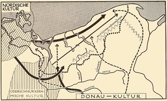 Als am Ende der Eiszeit die deutschen Ostseeküsten vom Gletschereise freigeworden waren, folgte dem nach Norden abziehenden Renntier der Renntierjäger, der damit der erste Bewohner der heutigen pommerschen Scholle wurde. Mit zunehmender Verbesserung der klimatischen Lebensbedingungen begannen die Menschen, die zunächst stammweise umherschweifend der Nahrungssuche nachgegangen waren, seßhafter zu werden; sie fingen an, regelmäßig Ackerbau und Viehzucht zu treiben, und bedienten sich dabei steinerner Waffen und Geräte. Zahlreiche Bodenfunde lassen ziemlich deutlich erkennen, wie diese Menschen des steinzeitlichen nordischen Kulturkreises gelebt haben. Durch ihre Verschmelzung mit dem von Mitteldeutschland sich ausbreitenden Volk der nach bestimmten Merkmalen ihrer Töpferware genannten "Schnurkeramiker" entstand in Nordwestdeutschland und Dänemark das G e r m a n e n t u m, während sich im heutigen Mittel- und Hinterpommern die Kultur der sogenannten Oderschnurkeramik herausbildete, die den Boden für die spätere Germanisierung des Landes vorbereitete.