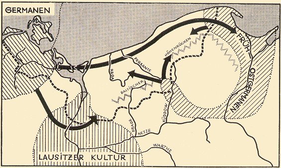 Aus Vorpommern, das zum "urgermanischen" Gebiet gehört, drangen in der mittleren und jüngeren Bronzezeit die Germanen in zwei Keilen nach Osten vor: längs der Küste bis zur Weichselmündung, und durch die Uckermark nach Mittelpommern. Um 1000 vor Chr. saßen an der unteren Oder, teilweise in festen Burgen, die nördlichen Vorposten der Lausitzer Kultur. Gleichzeitig bildete sich im Weichselmündungsgebiet die früh-ostgermanische Kultur, die die westgermanische bis hinter die Rega zurückdrängte. |