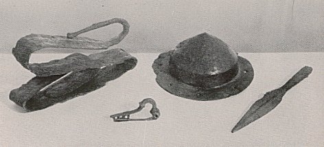 ![]() Waffengruppe der Eisenzeit. Lanzenspitze, Schildbuckel, Fibel und ein zusammengebogenes Schwert - zusammengebogen deshalb, weil es den abgeschiedenen Krieger nach germanischem Glauben nur in zerstörtem Zustande begleiten konnte. - Aus dem Pommerschen Landesmuseum. |