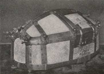 ![]() Der Cordulaschrein. Der Kamminer Domschatz besitzt als eins seiner kostbarsten Stücke diese Arbeit aus Elchgeweih, eins der hervorragenden Werke wikingischen Kunstfleißes aus Lund (um 1000 nach Chr.) |