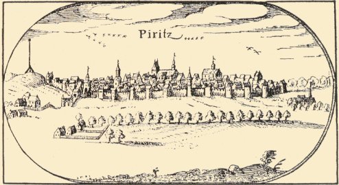 ![]() Ansicht von Pyritz. Nach dem Stadtbild auf der Pommernkarte des Rostocker Professors Eilhard Lubin, erschienen 1618 |