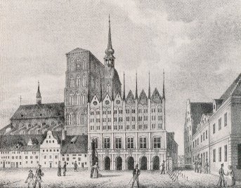 ![]() Rathaus und Nikolaikirche in Stralsund. Lithographie von L. Sanne u. Co. in Stettin. |