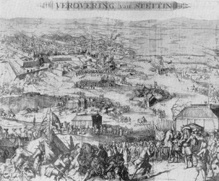 ![]() Eroberung Stettins durch den Großen Kurfürsten 1677. Nach einer Radierung von Romeyn de Hooghe, im Besitz des Stettiner Stadtmuseums. |