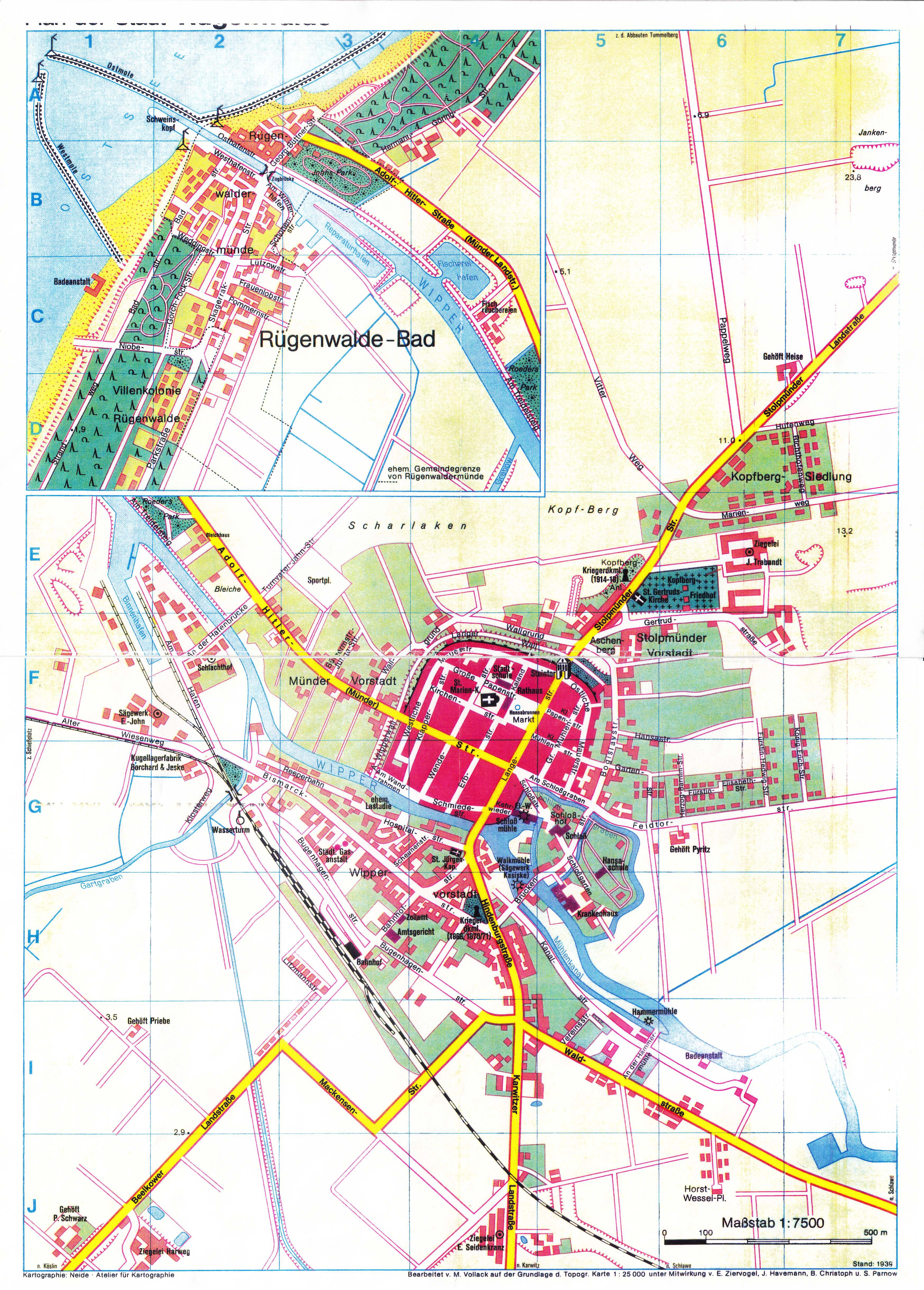Rügenwaldermünde zu werfen. Klicken Sie nur auf die Karte und der Ausschnitt wird näher harangezoomt. ImageZoom allows you to take a closer look at the map of city of Rügenwalde and Rügenwaldermünde. You can zoom in the map by clicking on the image. |