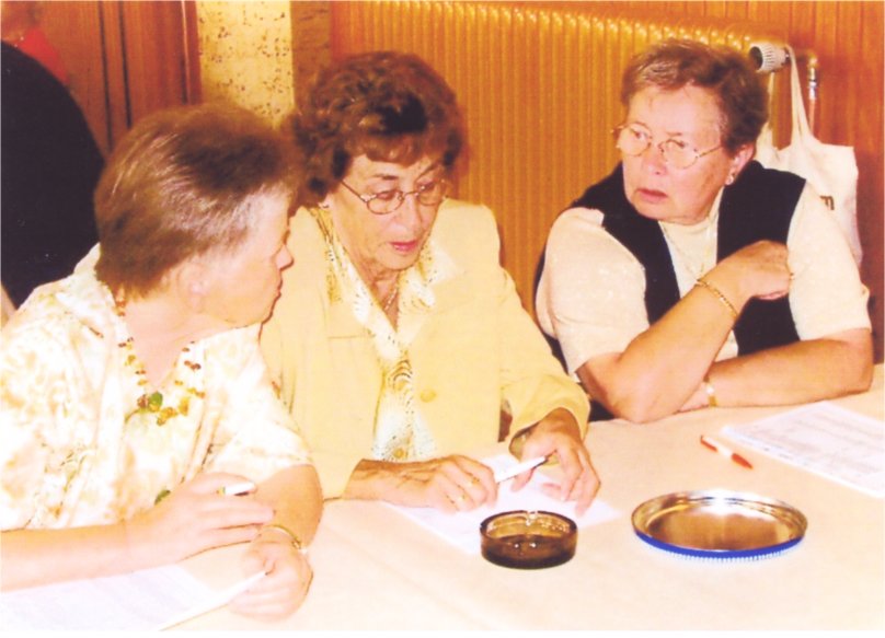 Nachdem Kuddl das Programm der nächsten zwei Tage bekannt gegeben hat, beginnt das große Palaver. Es wird über das verflossene Jahr gesprochen und dann natürlich von zu Hause. Auch wurde den im letzten Jahr verstorbenen Heimatfreunden gedacht. Danach, so kurz vor dem Abendbrot , werden dann die Gewinner der großen Tombola ermittelt. Ich mache mich auf die Runde und werde einige Bilder schießen und fange mit den drei Damen an. | |