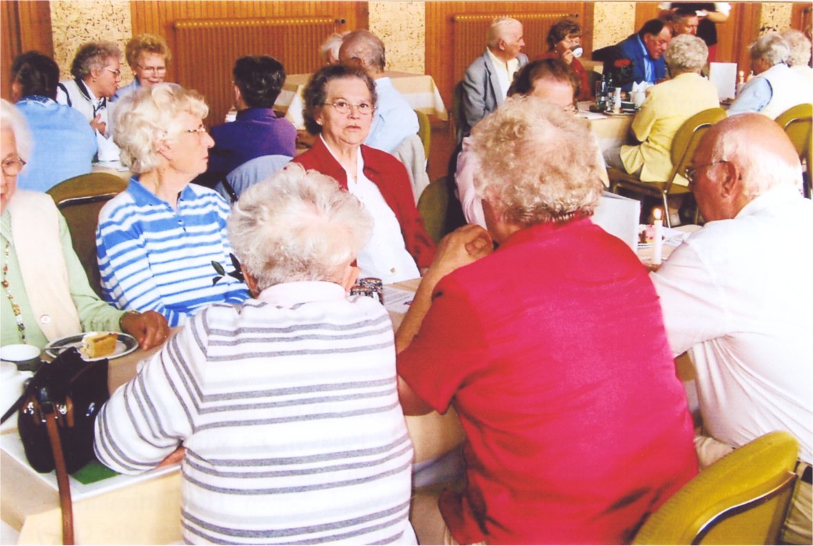 Die Pankokenkapelle. Ein Blick in einen Teil des Saales. Im Vordergrund am Tisch, auch mit dem alten Rügenwalder Wappen, sitzen im grauen Hemd Klaus Kühlberg und rechts Rudi Pramschüfer. Mit dem Rücken zu uns in dem blauen Pulli erkennen wir Inge Krebs mit Mann.
