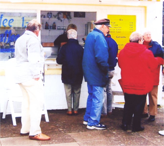 Hier werden die Eisportionen in Empfang genommen. Doch wie man sieht, es muss recht kalt gewesen sein, denn alle sind schön warm verpackt. |